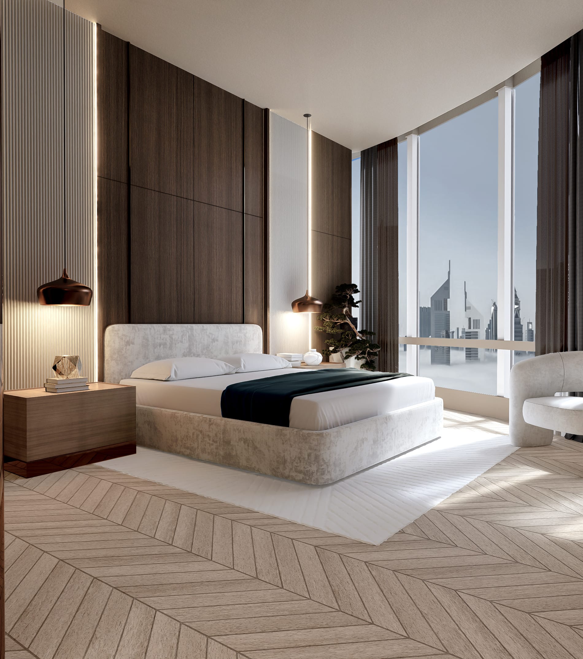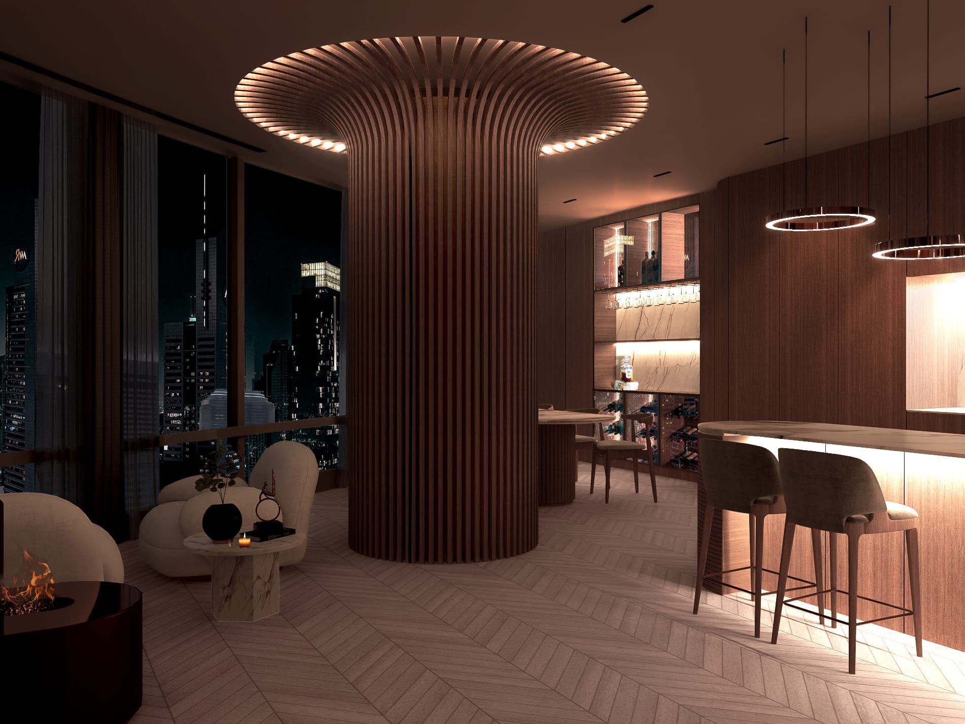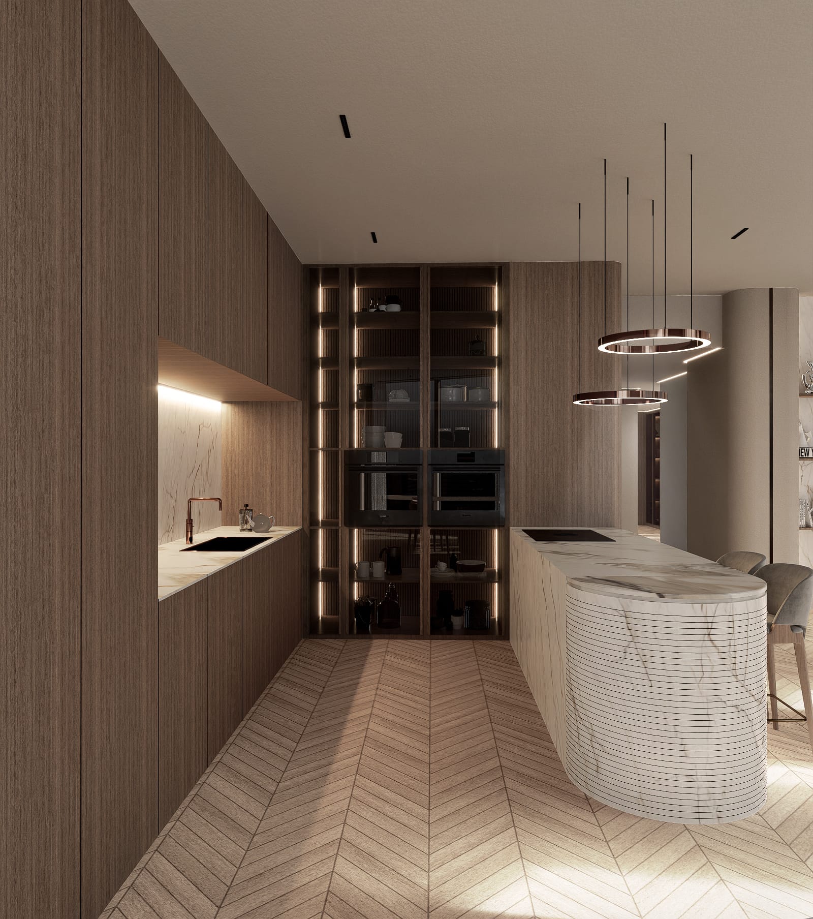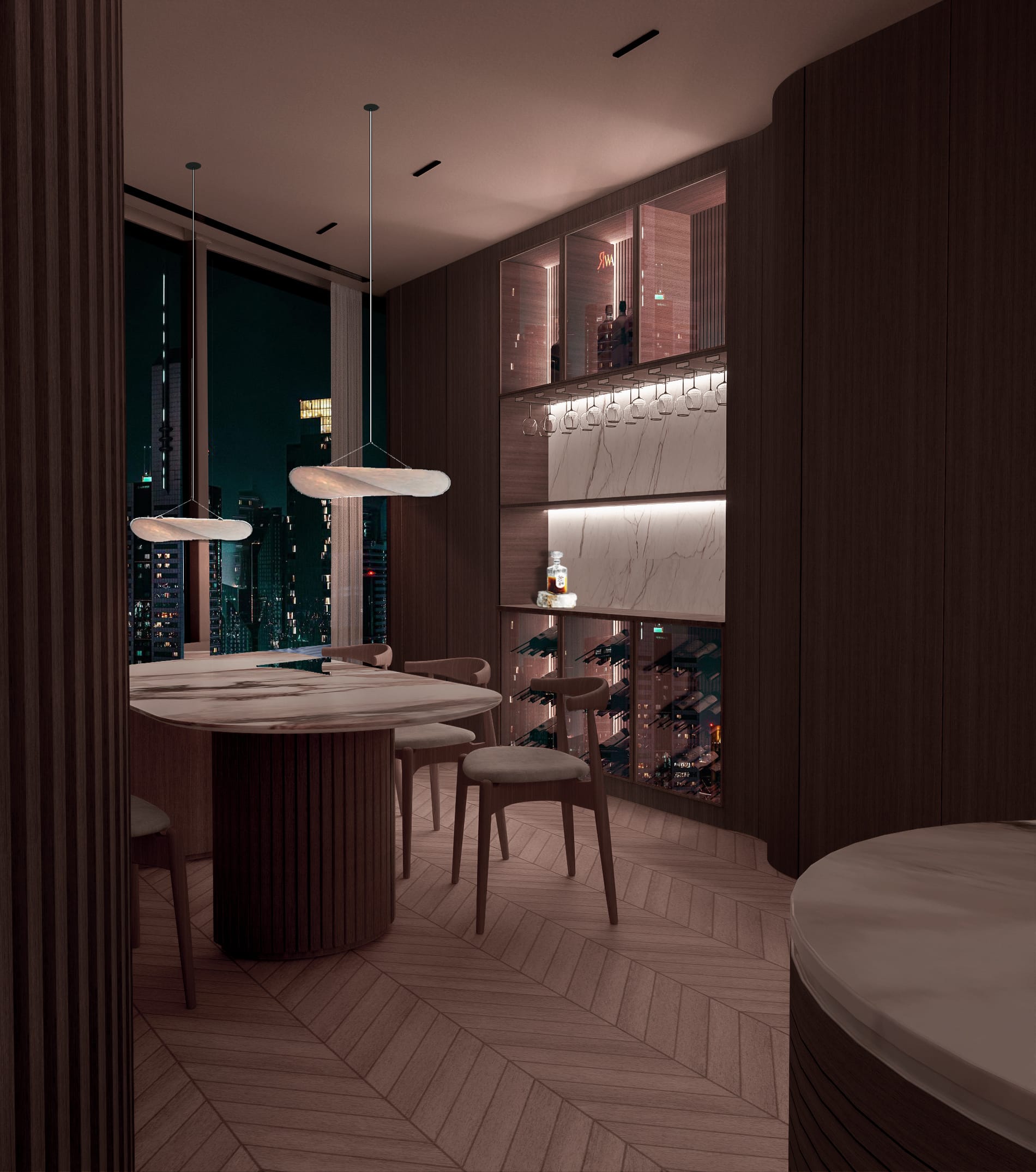 Når aftenen falder på, ændrer rummene karakter; et dybere nærvær tager over, og boligen vågner langsomt op i et spil af lys, hvor materialerne træder frem på nye måder. Valnøddens overflader får en dybere glød, messingdetaljerne fanger byens refleksioner, og marmoren i baren og nicherne begynder at kærtegne et blødt skær. Sammen skaber de en atmosfære, hvor lyset ikke blot oplyser – men danser mellem fladerne og trækker horisonten ind i interiøret.
