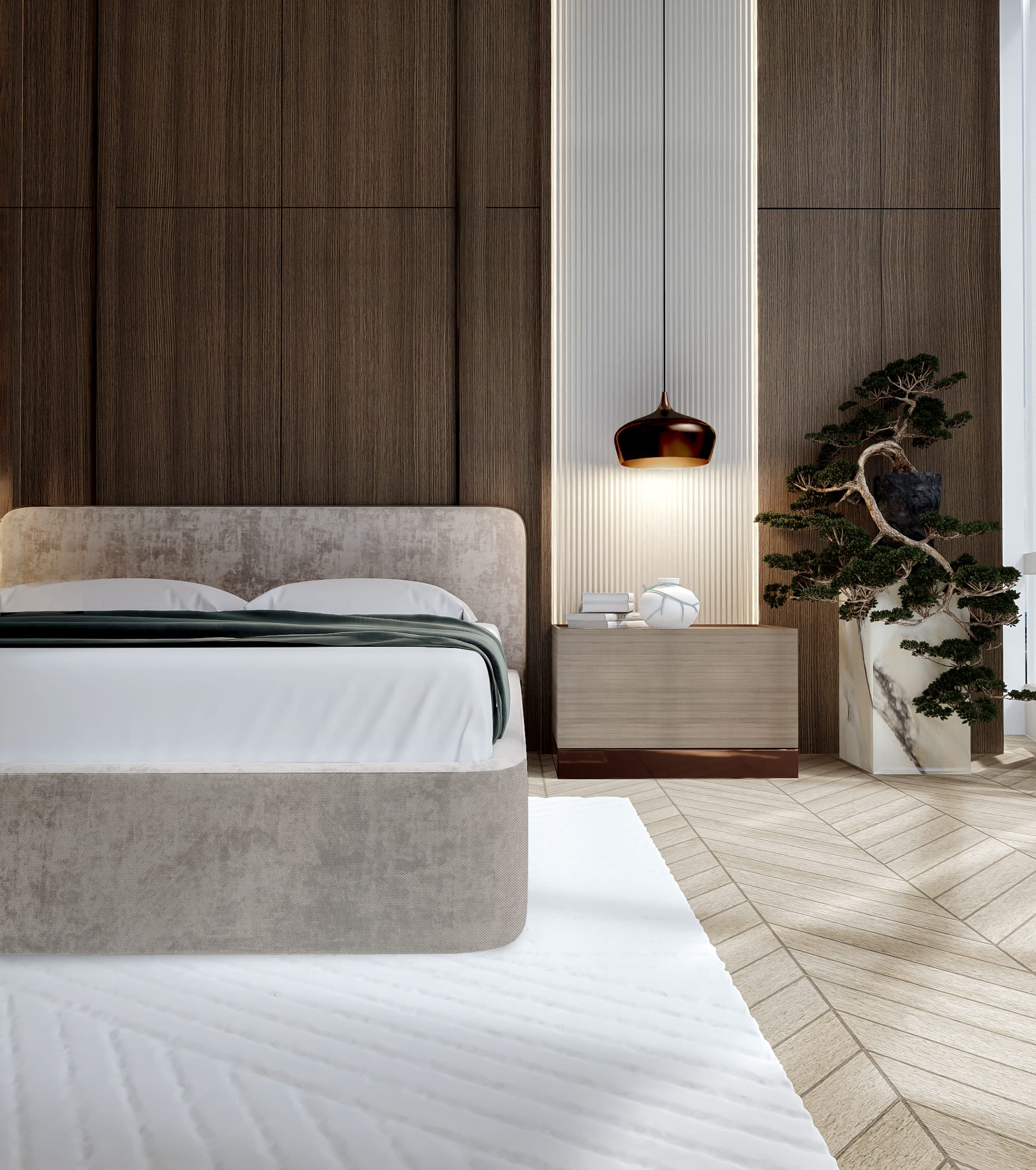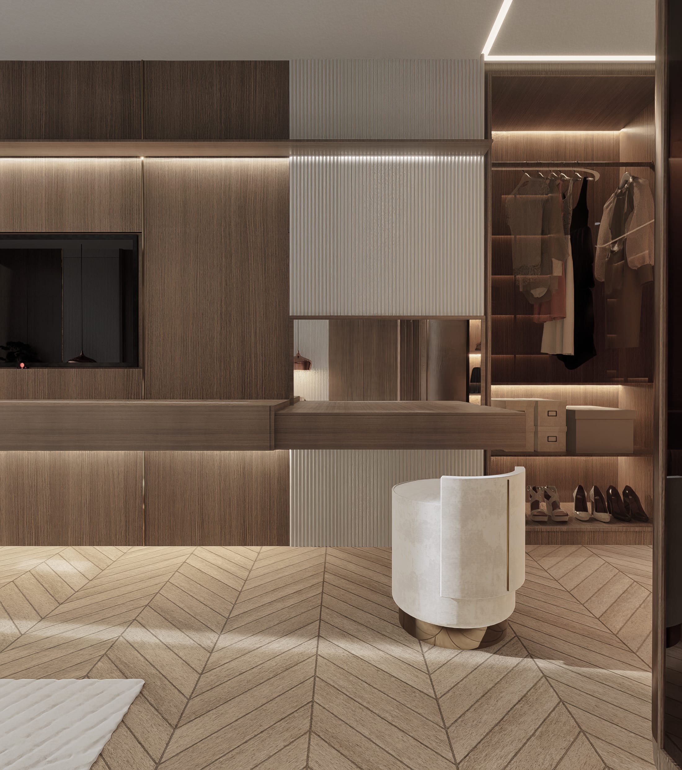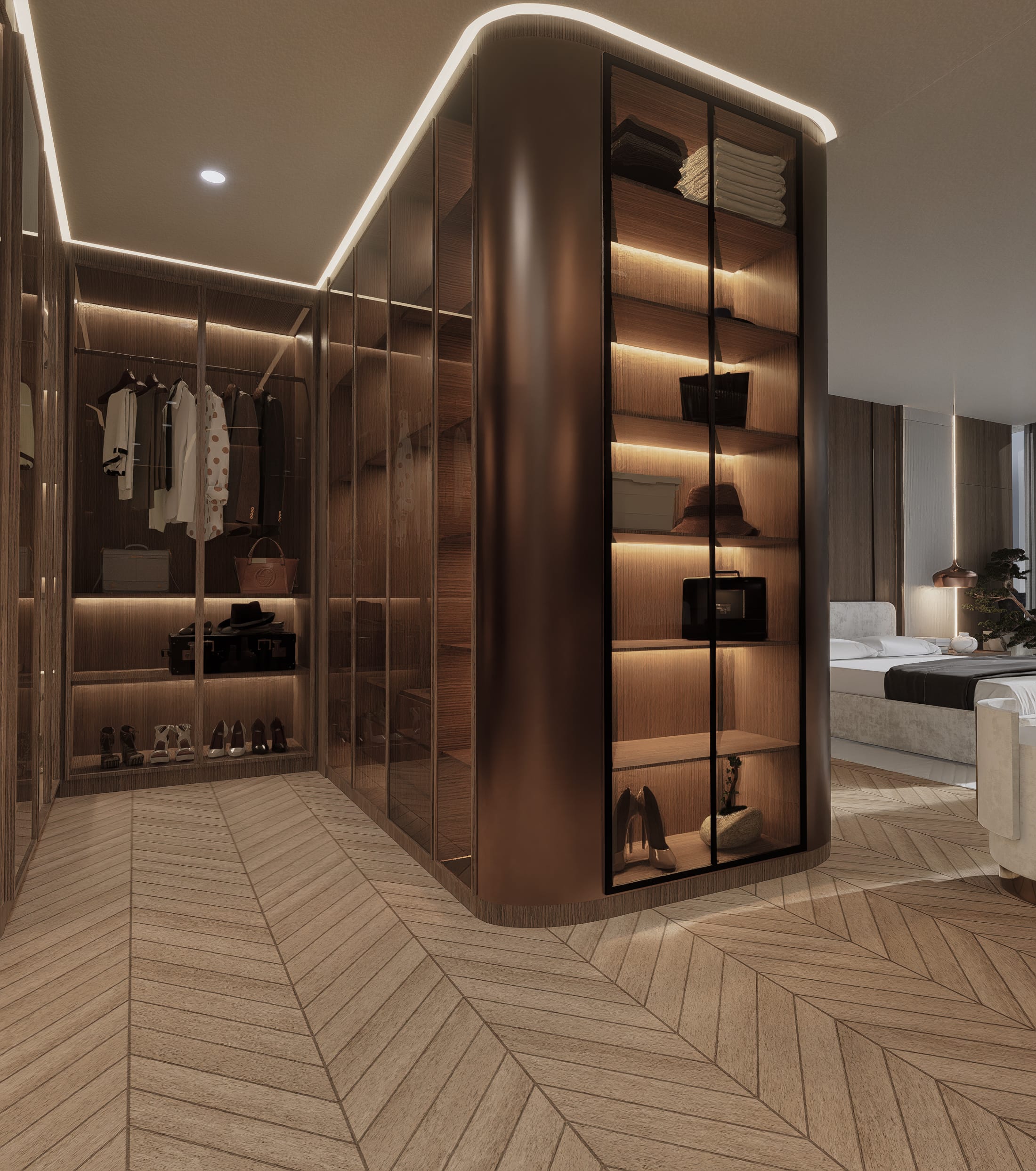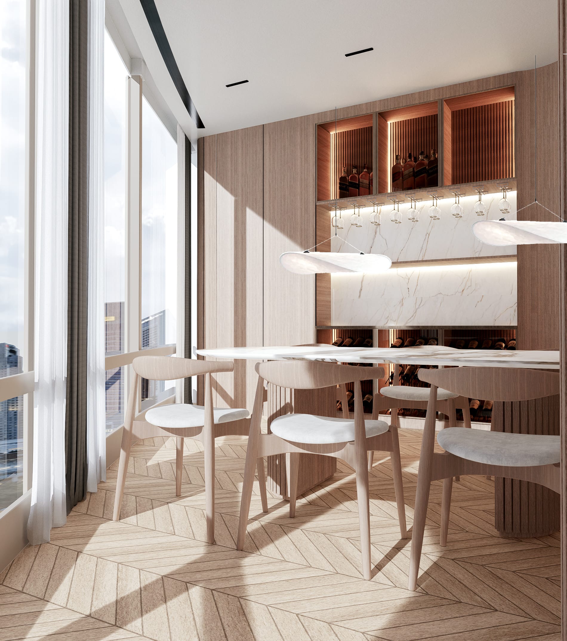 Når aftenen falder på, ændrer rummene karakter; et dybere nærvær tager over, og boligen vågner langsomt op i et spil af lys, hvor materialerne træder frem på nye måder. Valnøddens overflader får en dybere glød, messingdetaljerne fanger byens refleksioner, og marmoren i baren og nicherne begynder at kærtegne et blødt skær. Sammen skaber de en atmosfære, hvor lyset ikke blot oplyser – men danser mellem fladerne og trækker horisonten ind i interiøret.
