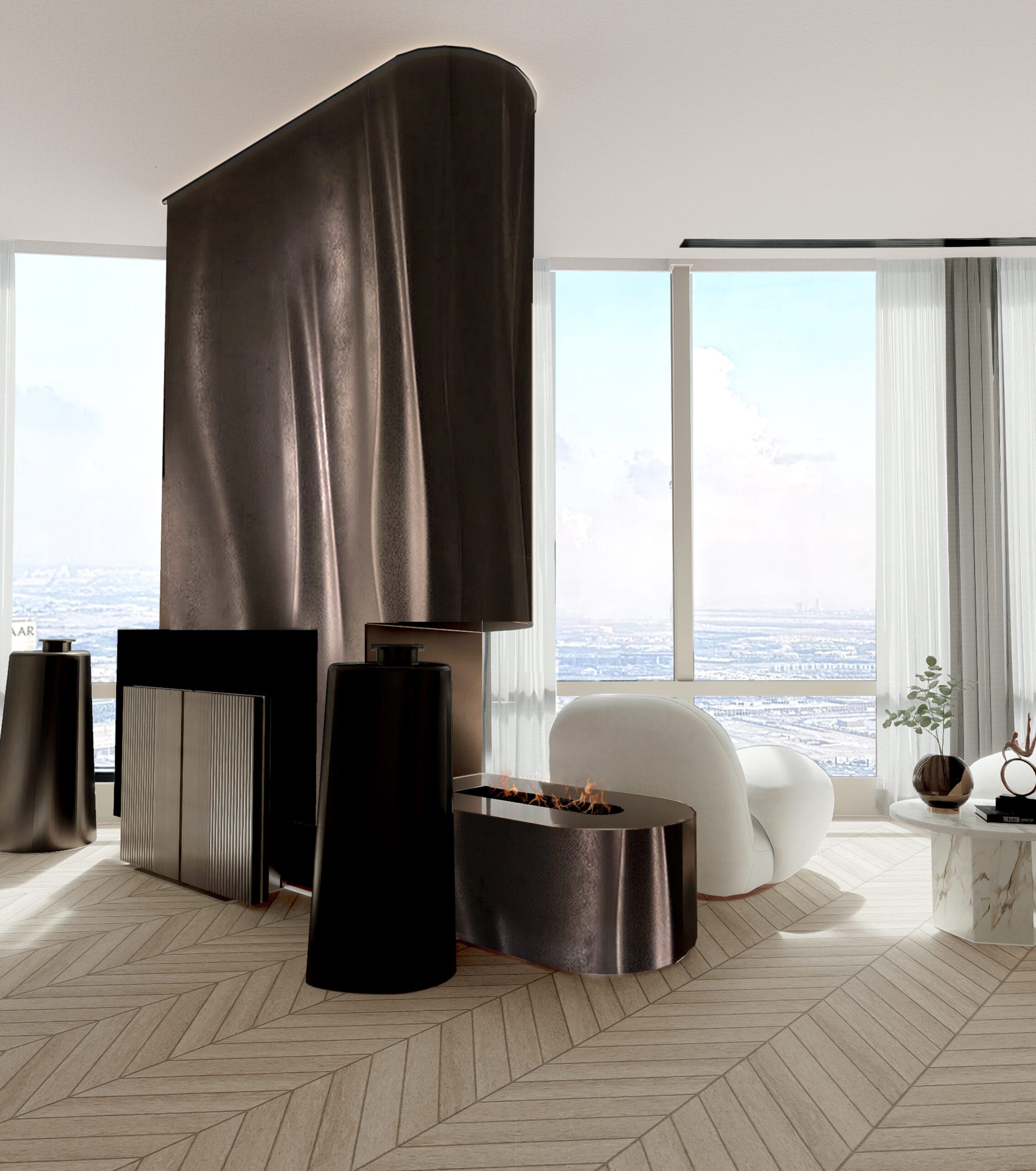 Med udsigten som naturligt centrum – et panorama, der strækker sig i alle retninger – har ambitionen været at åbne arkitekturen langt mere op. Kombinationen af højden og den brede horisont forstærkes i det øjeblik, rummene brydes op; pludselig mærker man ikke kun, at man står i verdens højeste bygning – udsigten træder ind og bliver en aktiv del af arkitekturen.