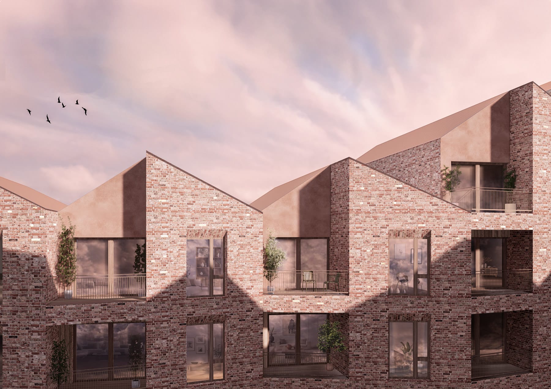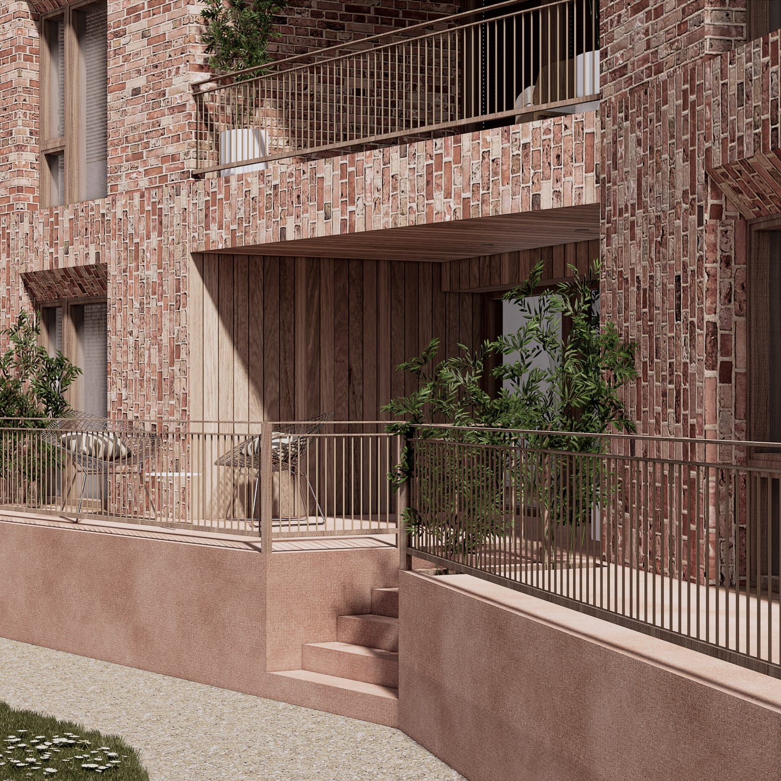Facaderne er muret i et spil af sten, hvor små forskydninger og variationer giver øjet noget at opdage, hver gang man passerer. Træfladerne tilfører varme, så både altaner og indgange føles tættere på menneskets skala.