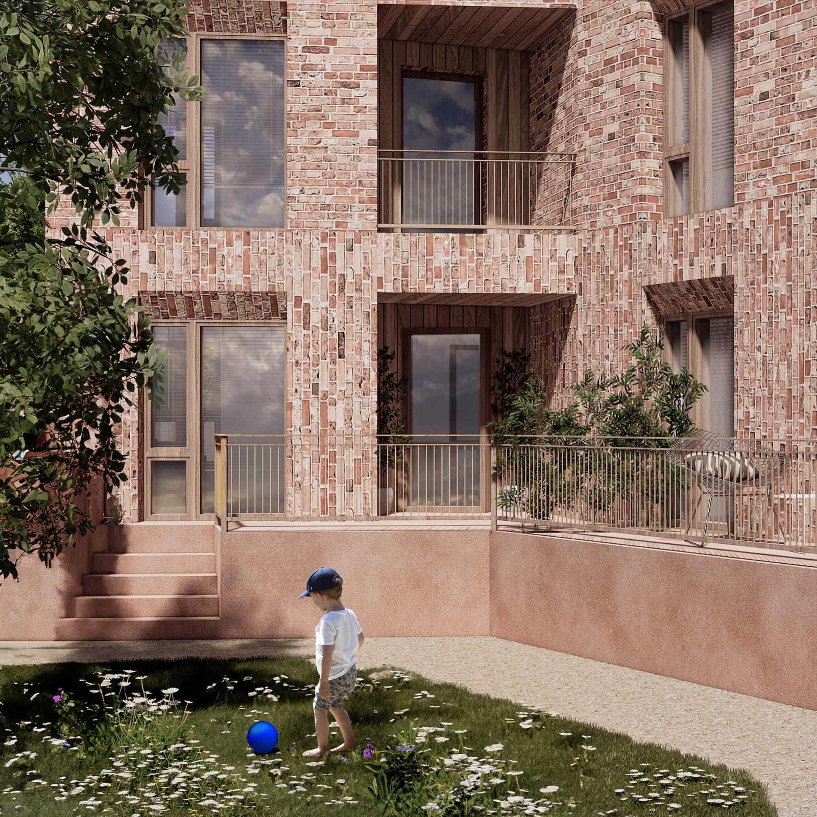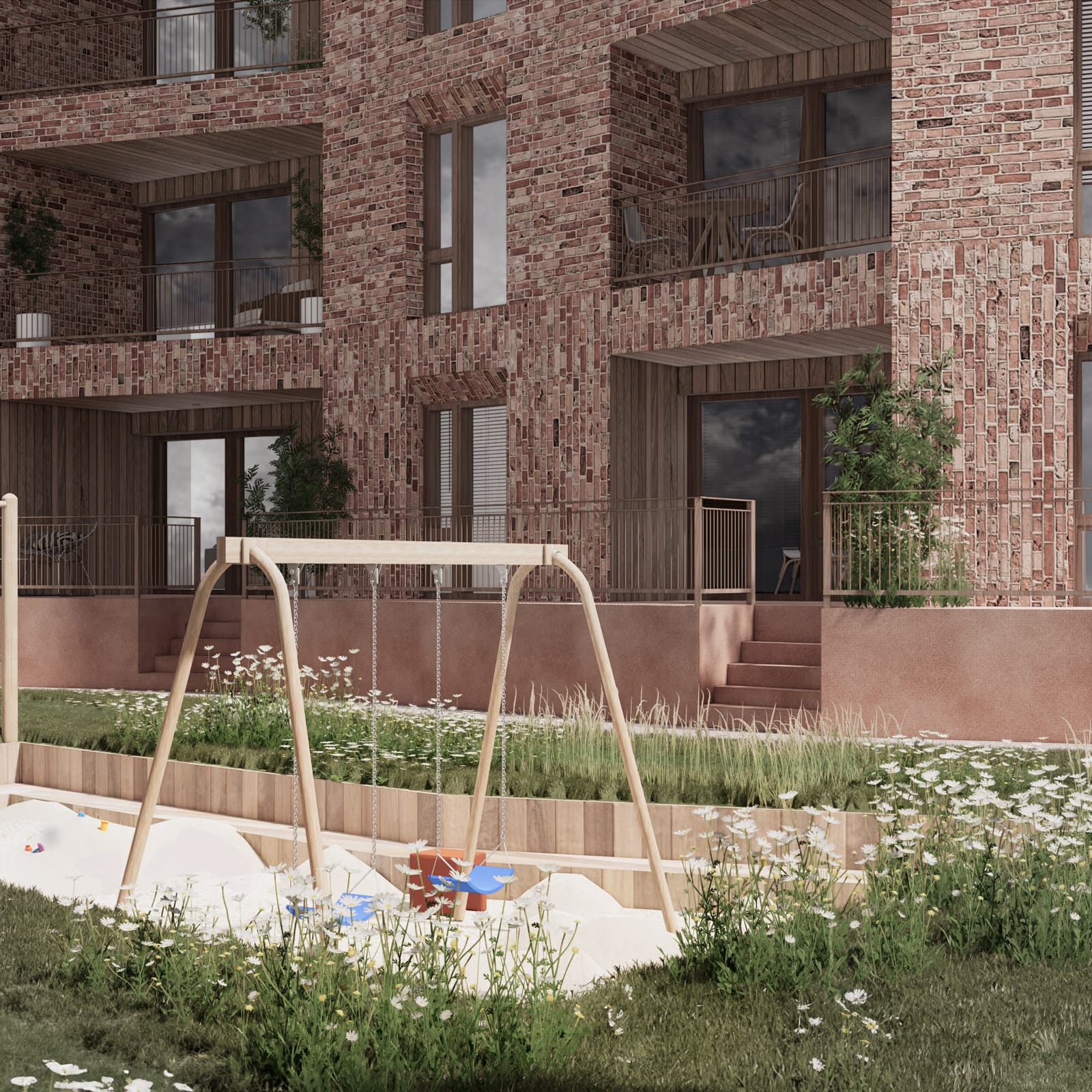 Mellem bygningerne åbner uderummene sig med grønne flader, legepladser og stier, der fører beboere på kryds og tværs. Her bliver mødet mellem børn, voksne og naboer en naturlig del af dagligdagen – men altid med lommer, hvor man kan trække sig tilbage.