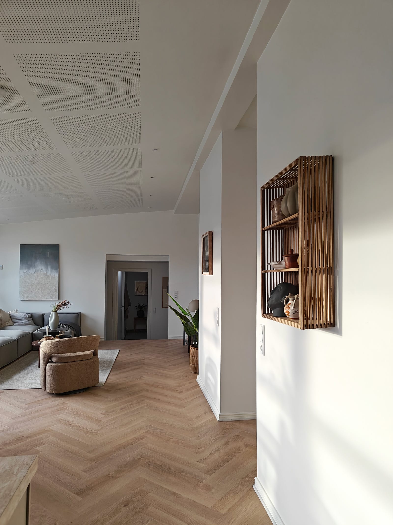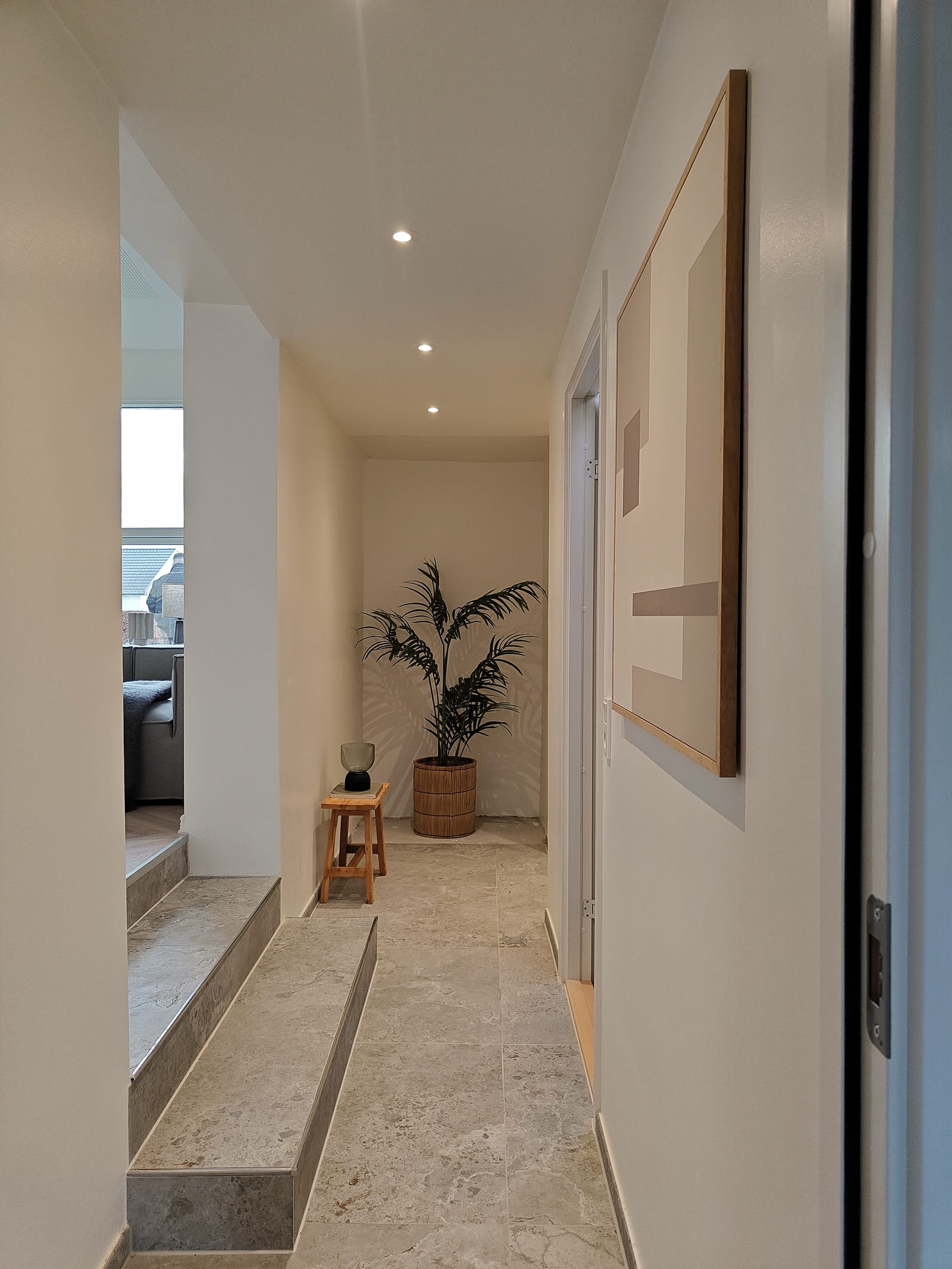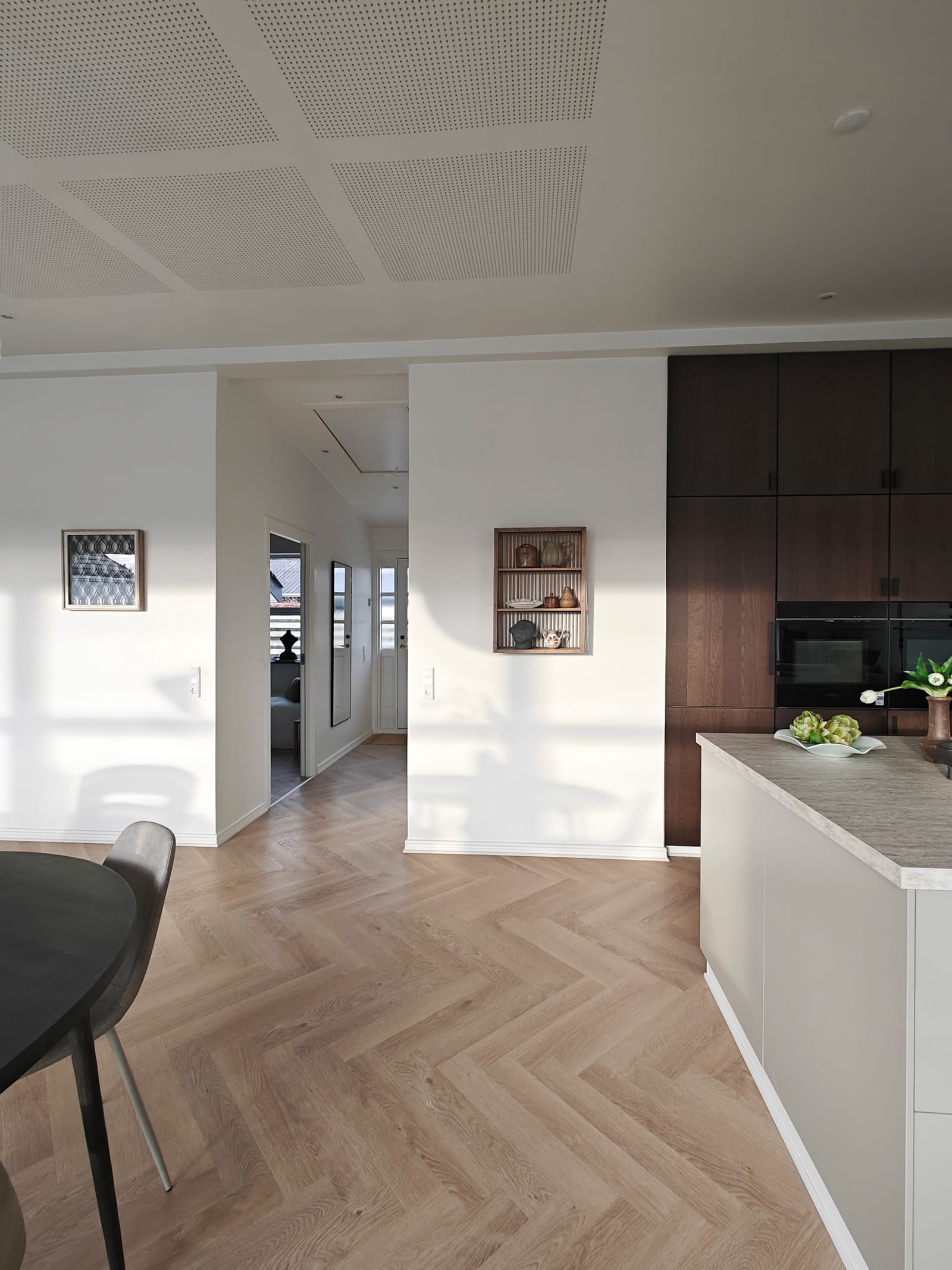 Materialerne er valgt for at skabe helhed: et køkken i varmt valnøddetræ står i kontrast til mere dæmpede flader, badeværelserne er udført i natursten med varme detaljer, der tilfører karakter, mens gulve i sildebensmønster binder rummene sammen i et kontinuerligt forløb.