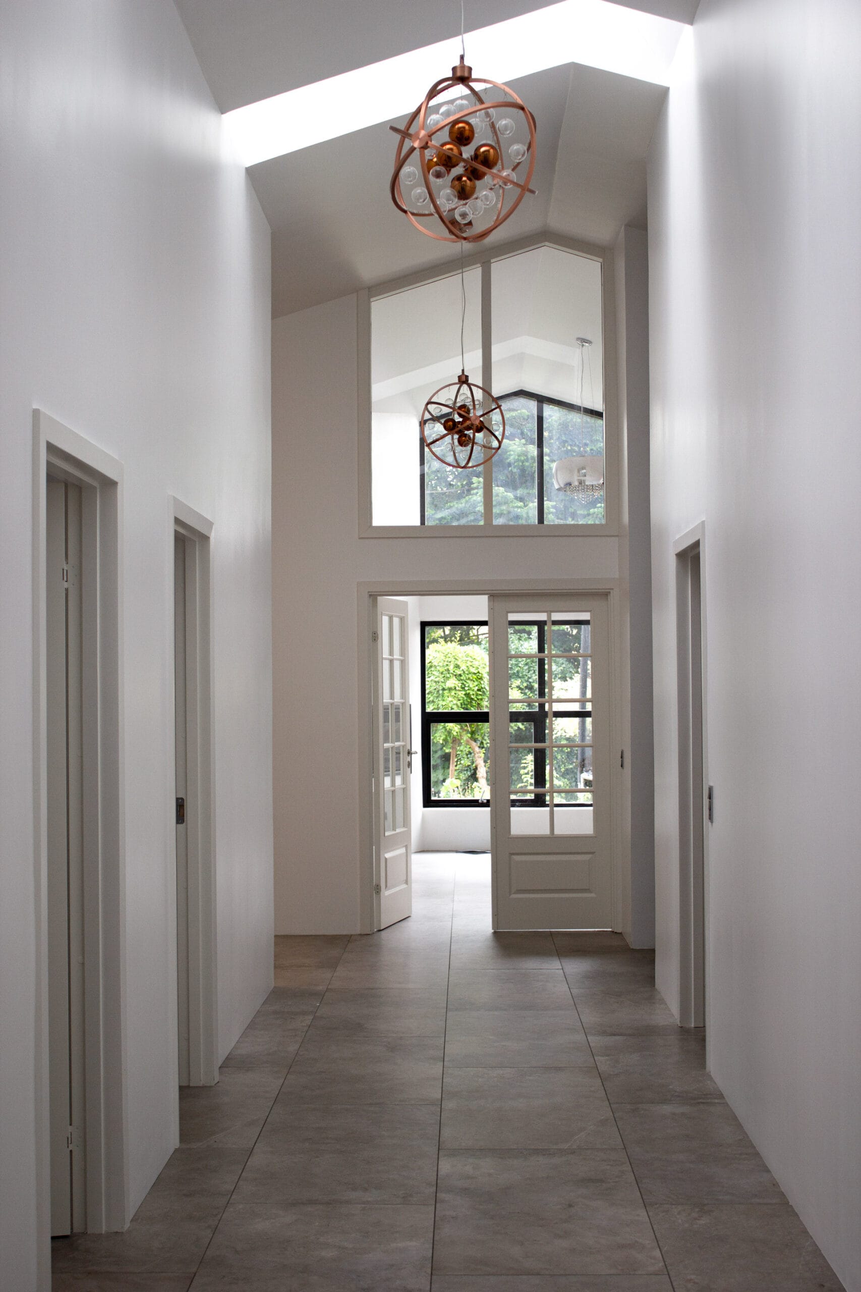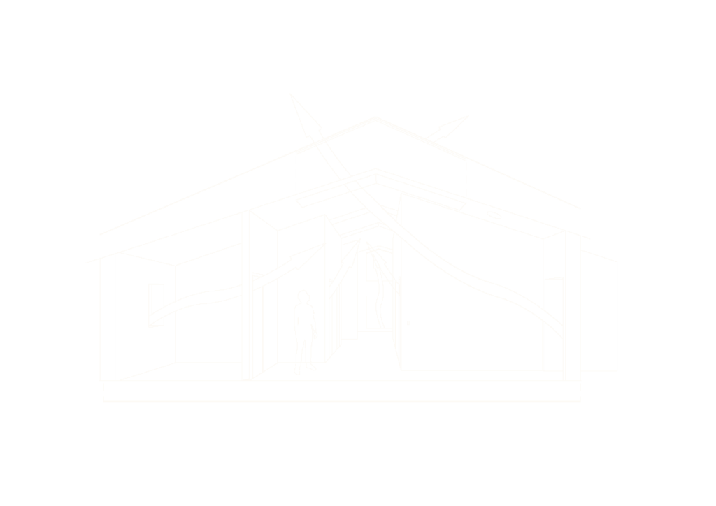 En stram, næsten monumental akse begynder i gangen og fortsætter ubrudt gennem stuen – båret af loftets forløb. Vinduerne mellem gang og stue er placeret med omhu for at lade blikket møde trækronerne.