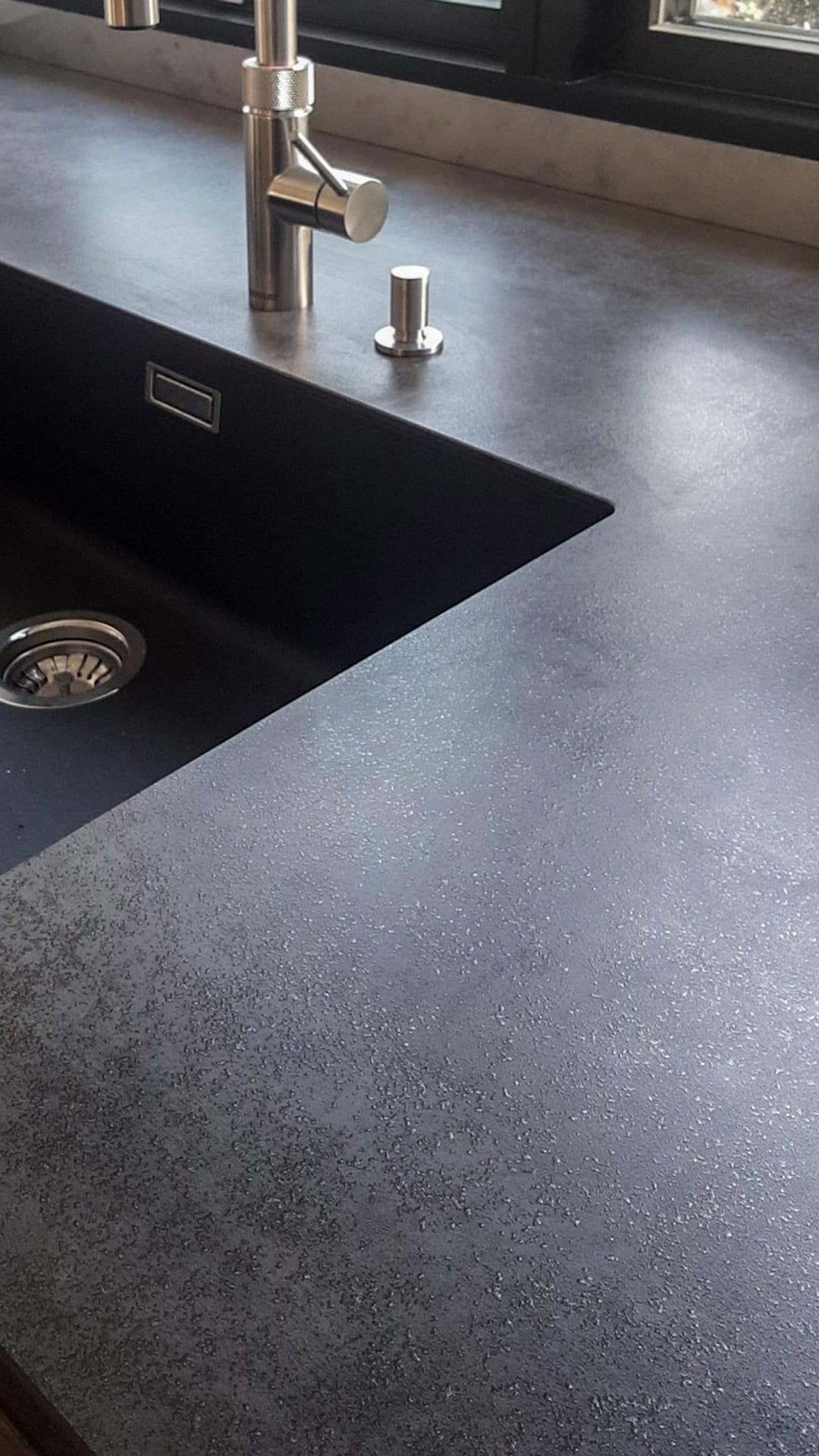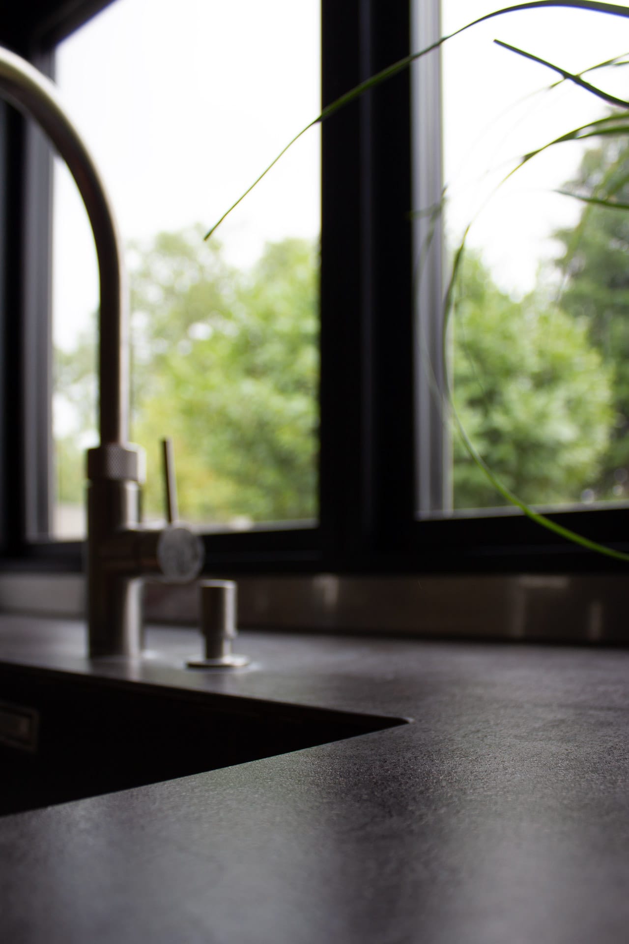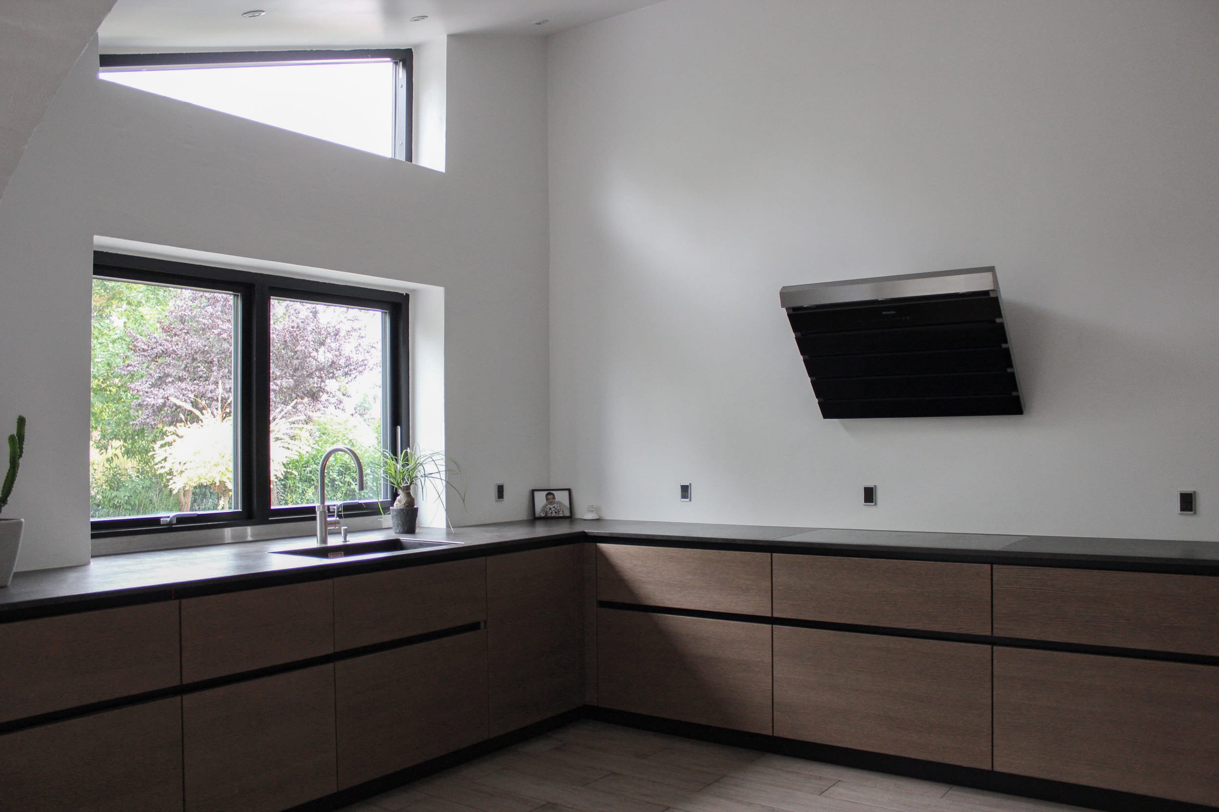 Køkkenet står i kontrast til rummets hvide flader og de høje vægge. Mørke fronter i træ og en sort bordplade giver tyngde til det diffuse lys, der strømmer ned fra oven.